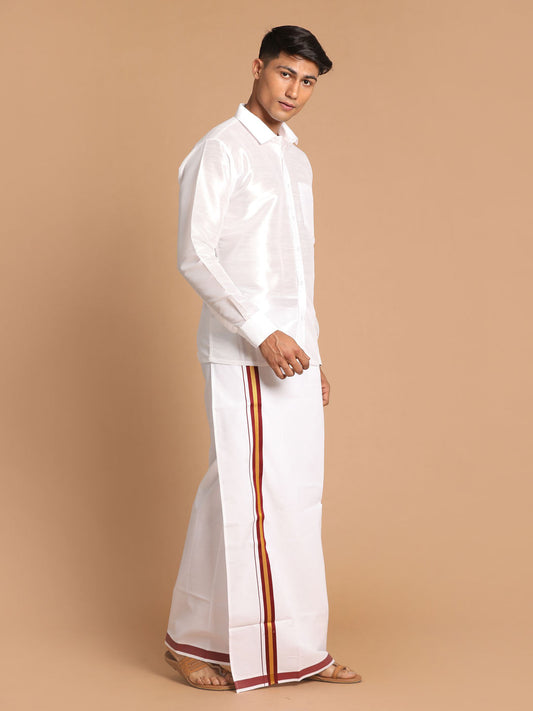 Vastramay Men's White Silk Blend Shirt And Mundu Set