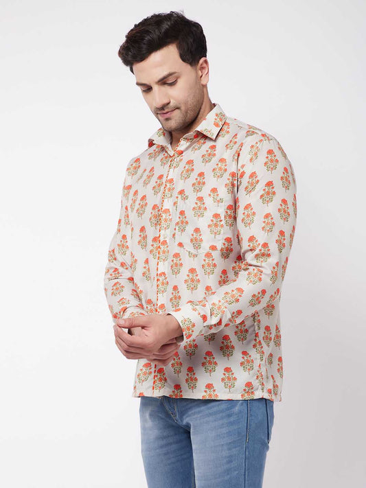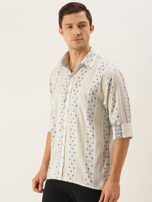 Vastramay Men's Cream Base Cotton Blend Printed Shirt