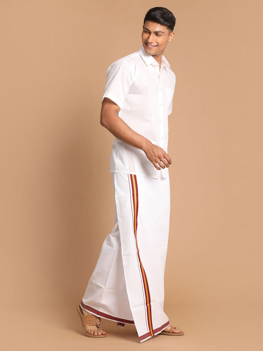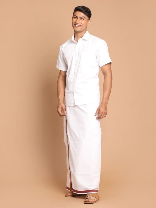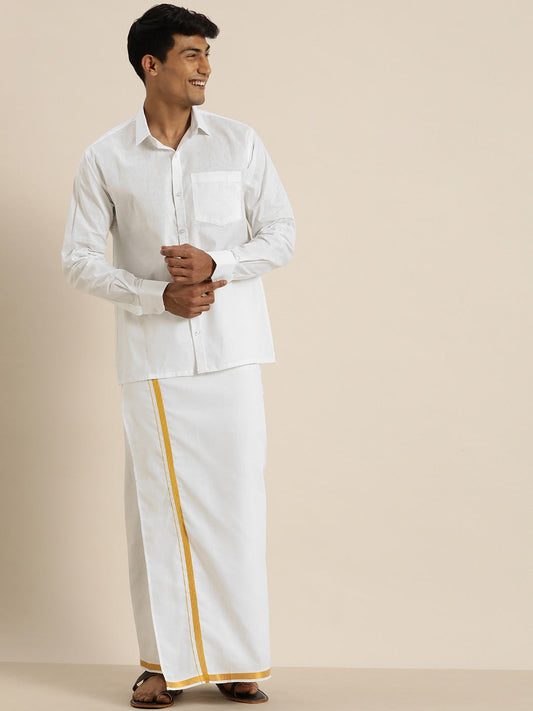 Vastramay Men's White Cotton Shirt With Mundu Set