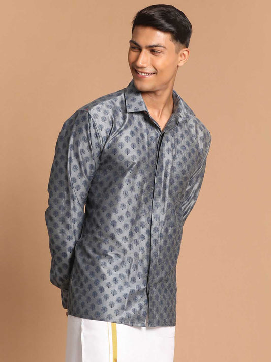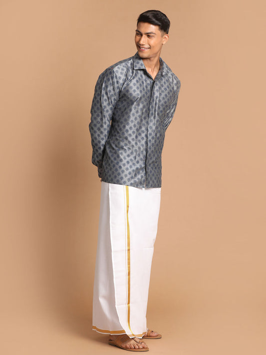 Vastramay Men's Gray Silk Blend Printed Shirt And Mundu Set