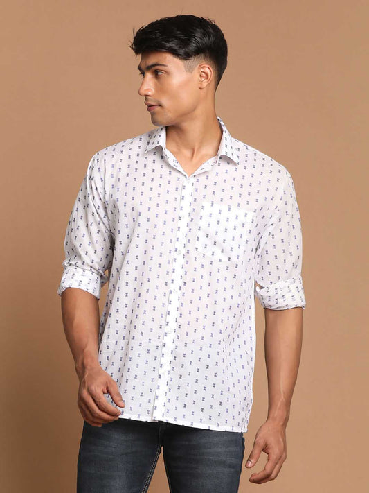 Vastramay Men's Blue And White Woven Design Cotton Shirt