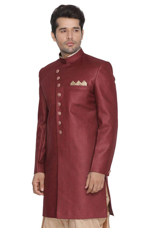 Vastramay Men's Maroon Silk Blend Sherwani Only Top