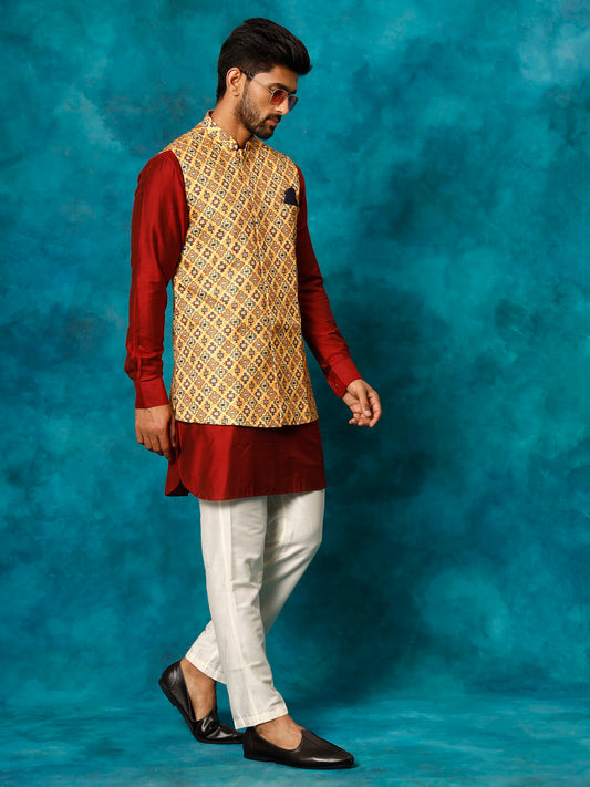 VASTRAMAY Men's Mustard Geometric Printed Nehru Jacket With Curved Kurta And Pant Set