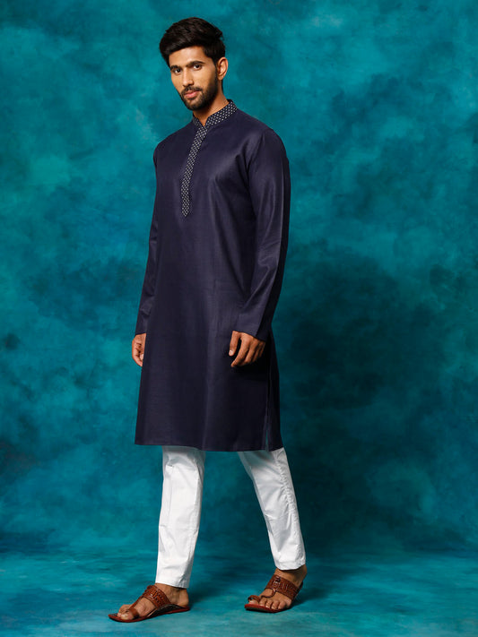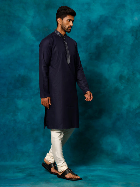 VASTRAMAY Men's Navy Blue And Cream Cotton Blend Kurta Pyjama Set