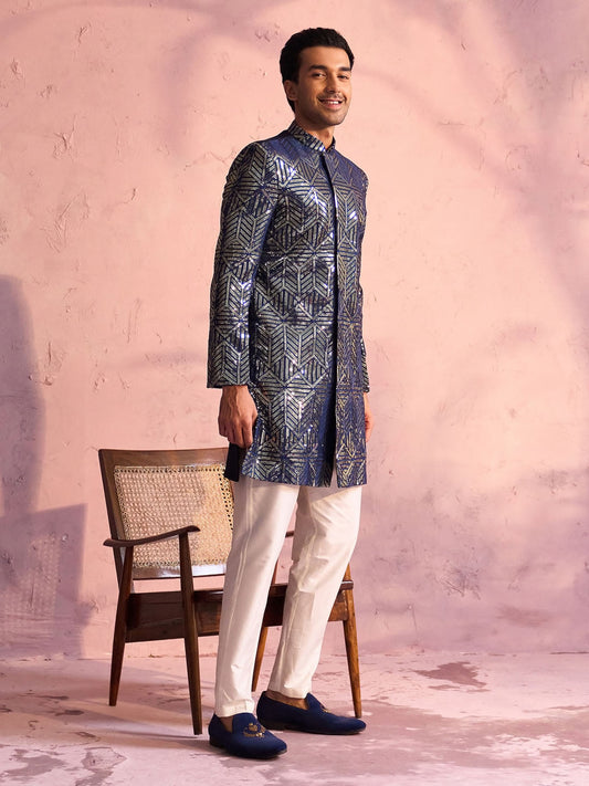 VASTRAMAY Men's Navy Blue And Pink Georgette Sherwani With Kurta Pyjama Set
