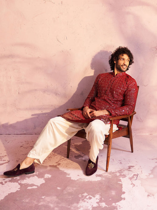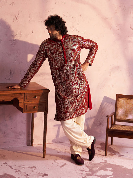 VASTRAMAY Men's Maroon Georgette Zari With Sequins Worked Kurta Patiala Set