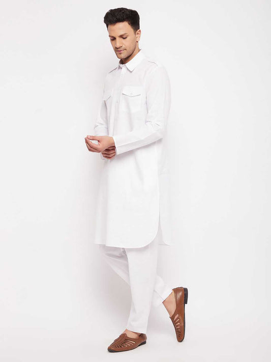 Vastramay Men's White Cotton Blend Pathani Suit Set