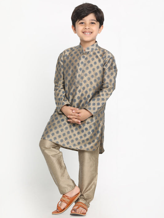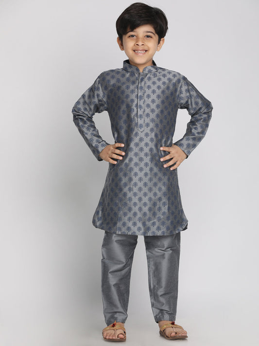 VASTRAMAY Grey Silk Blend Ethnic Print Kurta Pyjama Sibling Set