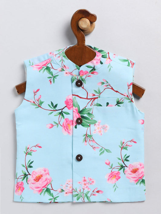VASTRAMAY SISHU Boy's Aqua Blue Floral Silk Blend Nehru Jacket
