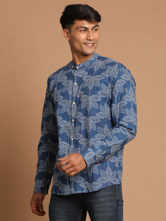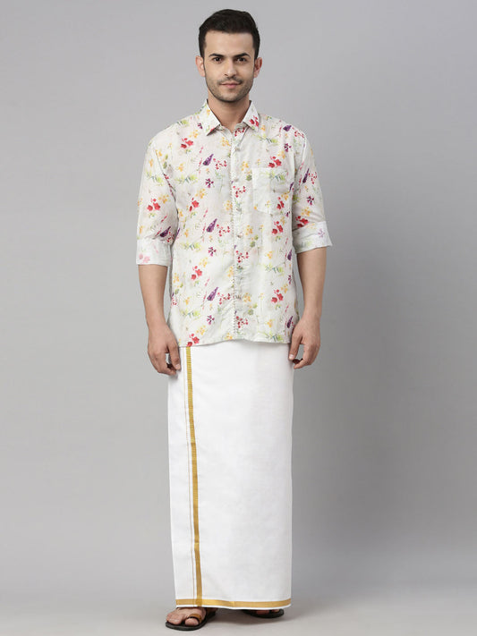 Vastramay Men's Cream Floral Print Shirt And Mundu Set