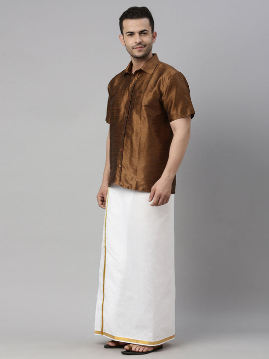 Vastramay Men's Coffee Solid Ethnic Shirt And Mundu Set