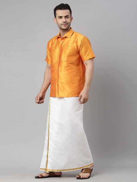 Vastramay Men's Orange Solid Ethnic Shirt And Mundu Set