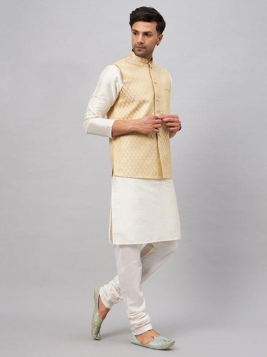 VASTRAMAY Men's Cream Silk Blend Jacket with Kurta Pyjama Set