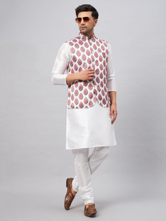 VASTRAMAY Men's Multicolor Printed Ethnic Jacket With White Cotton Blend Kurta and Pyjama Set