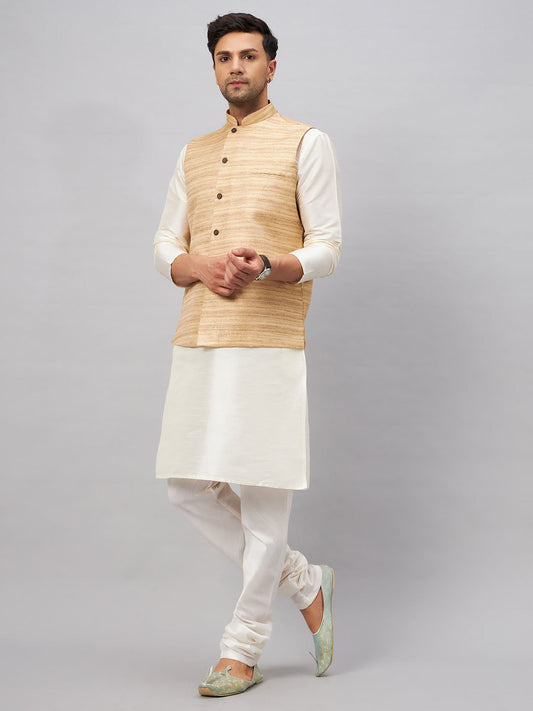 VASTRAMAY Men's Beige Matka Silk Nehru Jacket With Cream Silk Blend Kurta Pyjama Set