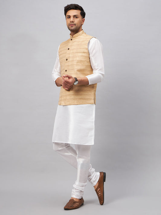 VASTRAMAY Men's Beige Matka Silk Nehru Jacket With White Silk Blend Kurta Pyjama Set