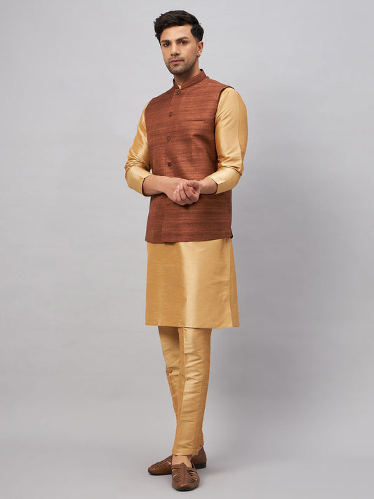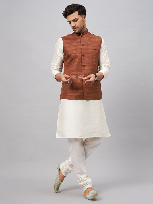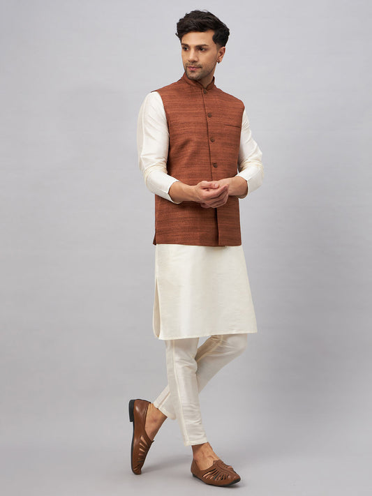 VASTRAMAY Men's Coffee Matka Silk Nehru Jacket With Cream Silk Blend Kurta Pyjama Set