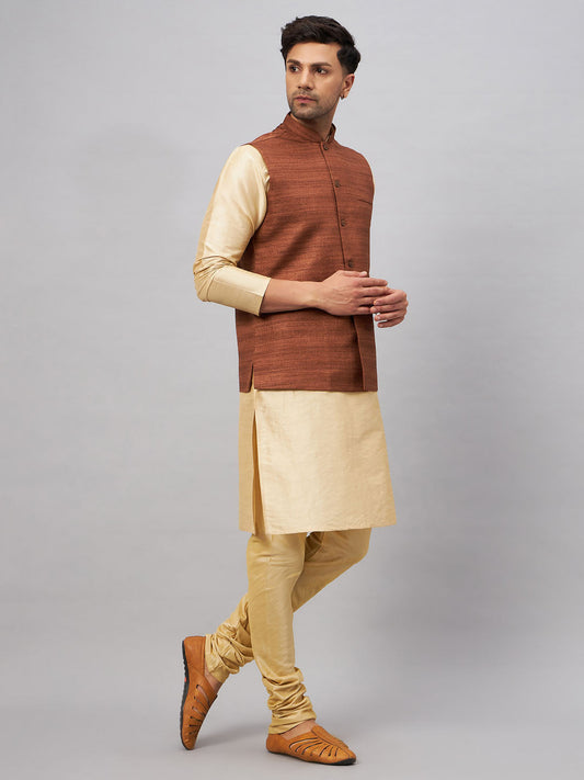 VASTRAMAY Men's Coffee Jacket With Gold Kurta And Pant Set