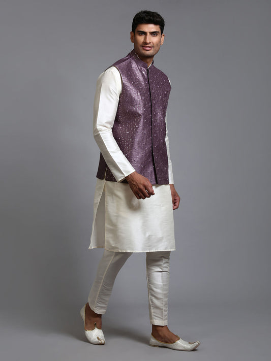 VASTRAMAY Men's Purple Embellished Jacket with Cream Kurta Pant Set