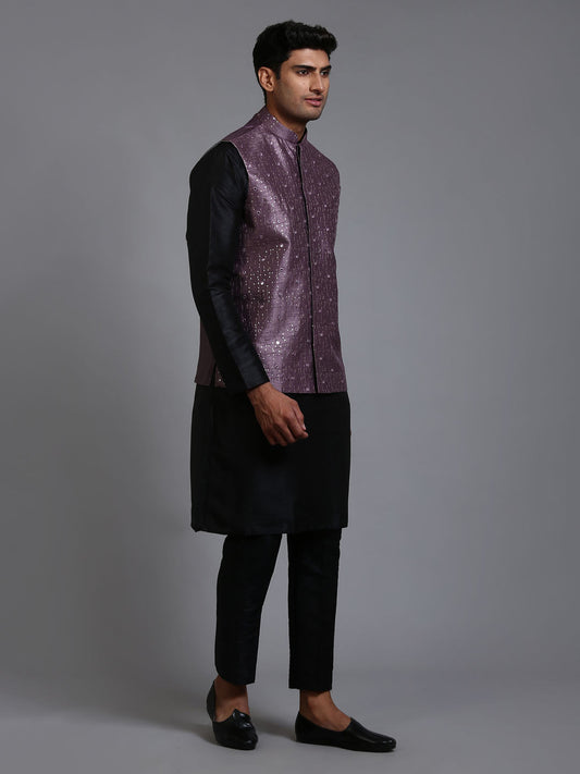VASTRAMAY Men's Purple Embellished Jacket with Black Kurta Pant Set