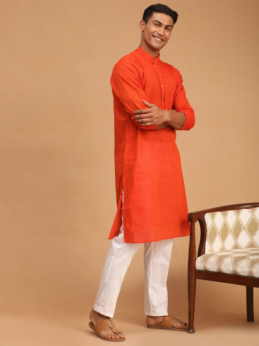 SHVAAS by VASTRAMAY Men's Red Cotton Handloom Kurta With White Cotton Pant Set