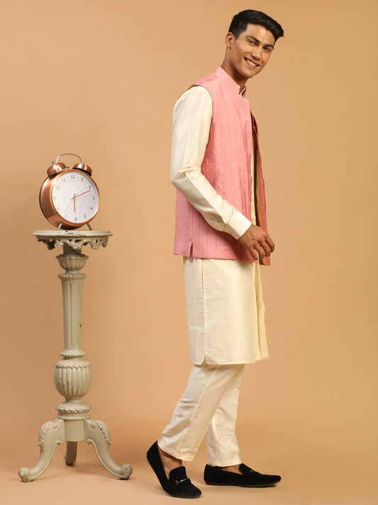 VASTRAMAY Men's Plus Size Cream Ethnic Cream Jacket With Pink Silk Blend Kurta and Golden Pyjama Set