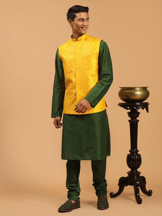 VASTRAMAY Men's Yellow Embellished Ethnic Nehru Jacket with Kurta Pyjama Set