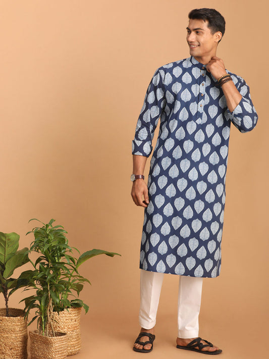 VASTRAMAY Men's Blue Leaf Print cotton Kurta With White Pant Style pyjama Set