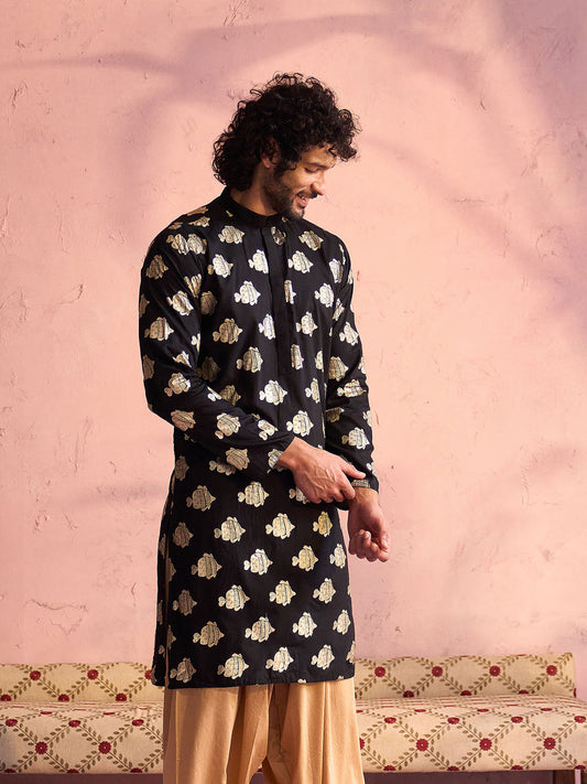 VASTRAMAY Men's Black Viscose Fish Motif Foil Print Kurta