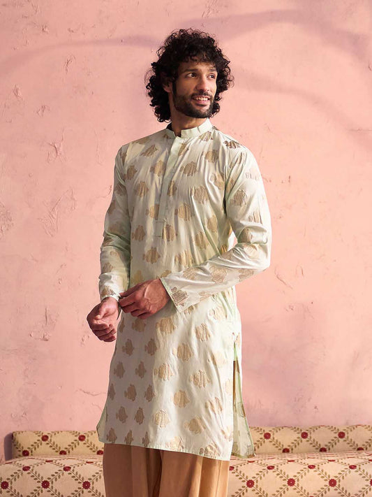 VASTRAMAY Men's Mint Green Viscose Fish Motif Foil Print Kurta