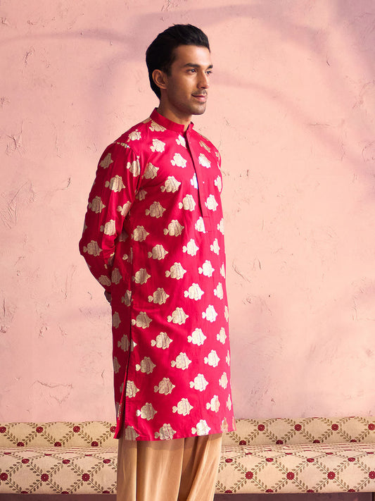 VASTRAMAY Men's Rani Pink Viscose Fish Motif Foil Print Kurta