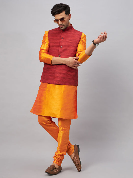 VASTRAMAY Men's Maroon Jacket With Orange Kurta And Pyjama Set