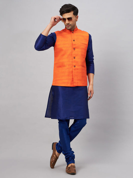 VASTRAMAY Men's Orange Jacket With Blue Solid Silk Blend Kurta and Pyjama Set