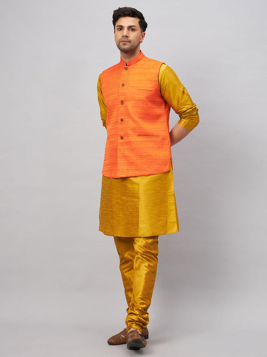 VASTRAMAY Men's Orange Jacket With Mustard Kurta And Pyjama Set