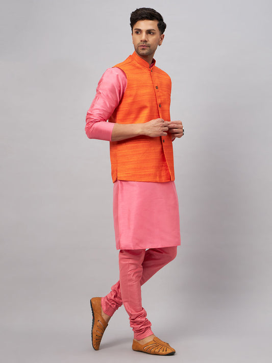 VASTRAMAY Men's Orange Jacket With Pink Kurta And Pyjama Set