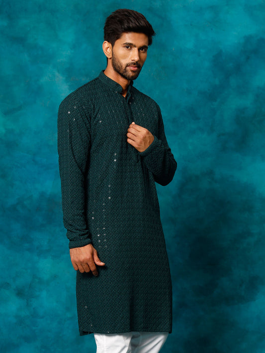 VASTRAMAY Men's Green Rayon Schiffli Kurta