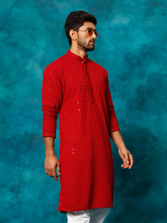 VASTRAMAY Men's Maroon Rayon Schiffli Kurta