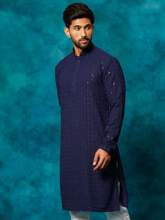 VASTRAMAY Men's Navy Blue Rayon Schiffli Kurta