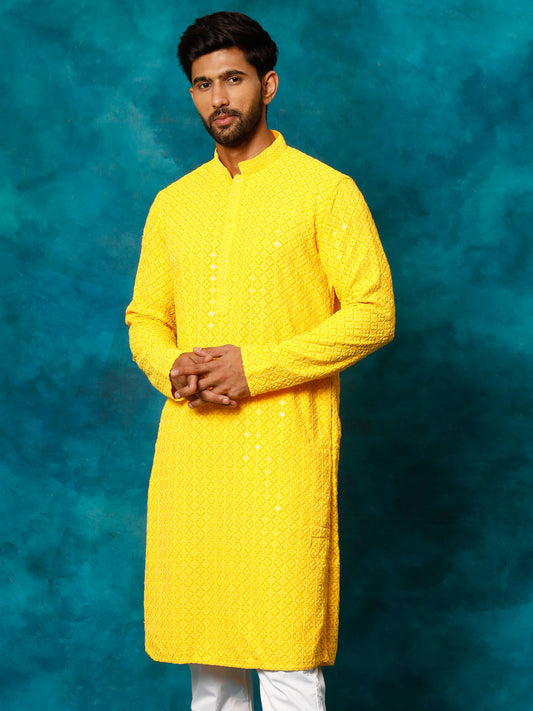 VASTRAMAY Men's Yellow Rayon Schiffli Kurta