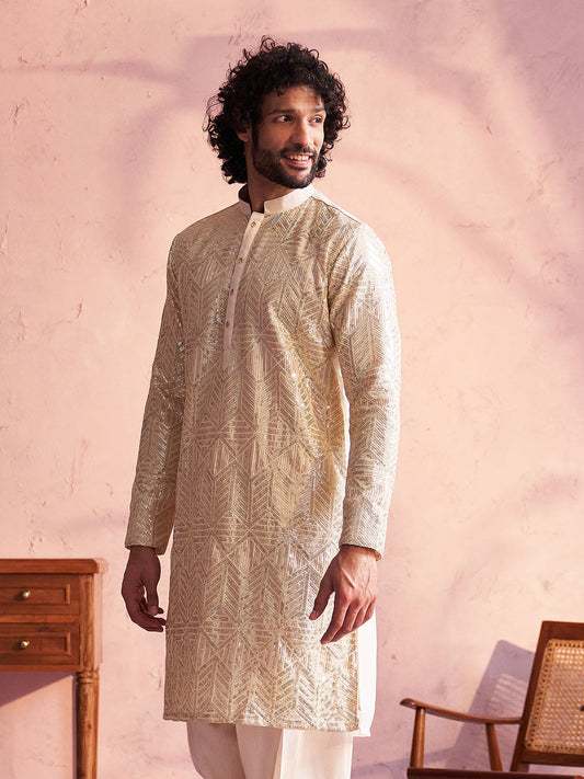 VASTRAMAY Men's Cream Georgette Embellished Kurta