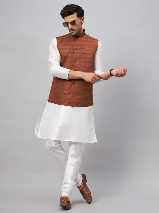 VASTRAMAY Men's Coffee Matka Silk Nehru Jacket With White Silk Blend Kurta Pyjama Set