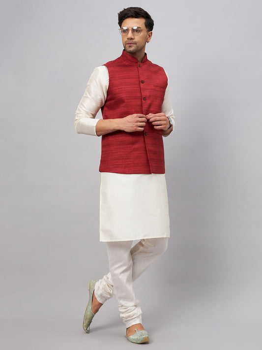 VASTRAMAY Men's Maroon Matka Silk Nehru Jacket With Cream Silk Blend Kurta Pyjama Set