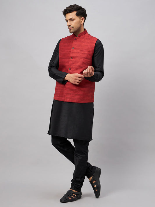VASTRAMAY Men's Maroon Jacket With Black Solid Silk Blend Kurta and Pyjama Set