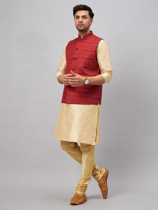 VASTRAMAY Men's Maroon Silk Blend Ethnic Jacket With Gold Kurta and Maroon Pant Style Pyjama Set