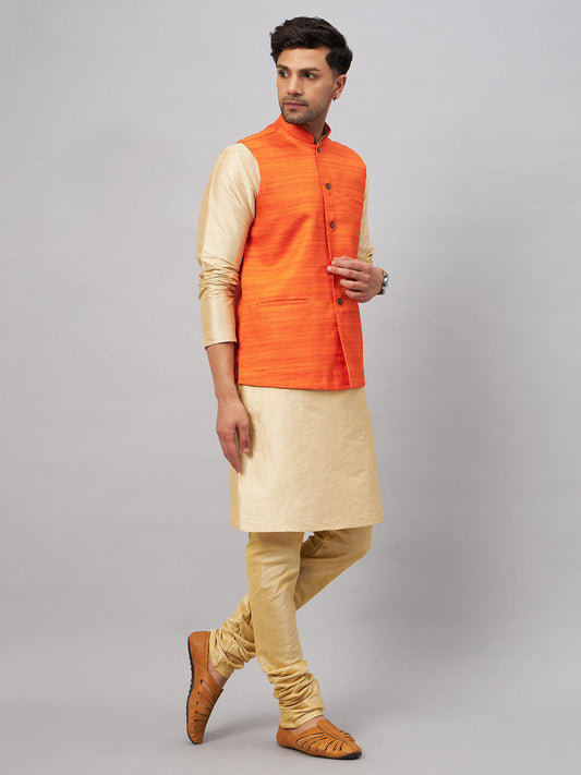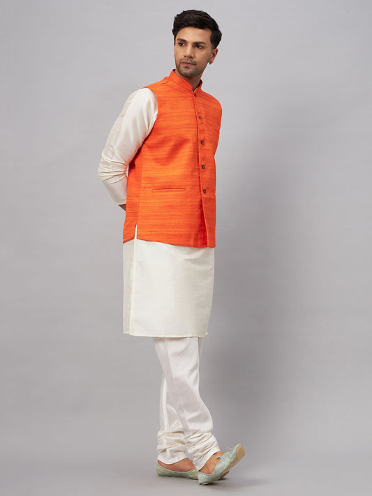 VASTRAMAY Men's Orange Matka Silk Nehru Jacket With Cream Silk Blend Kurta Pyjama Set