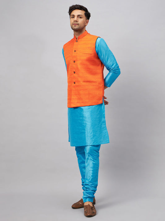 VASTRAMAY Men's Orange Matka Silk Nehru Jacket With Aqua Blue Silk Blend Kurta and Pyjama Set