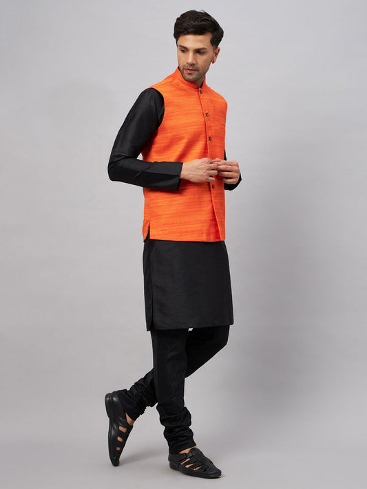 VASTRAMAY Men's Orange Jacket With Black Solid Silk Blend Kurta and Pyjama Set
