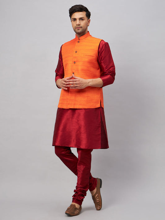 VASTRAMAY Men's Orange Matka Silk Nehru Jacket With Maroon Silk Blend Kurta Pyjama Set