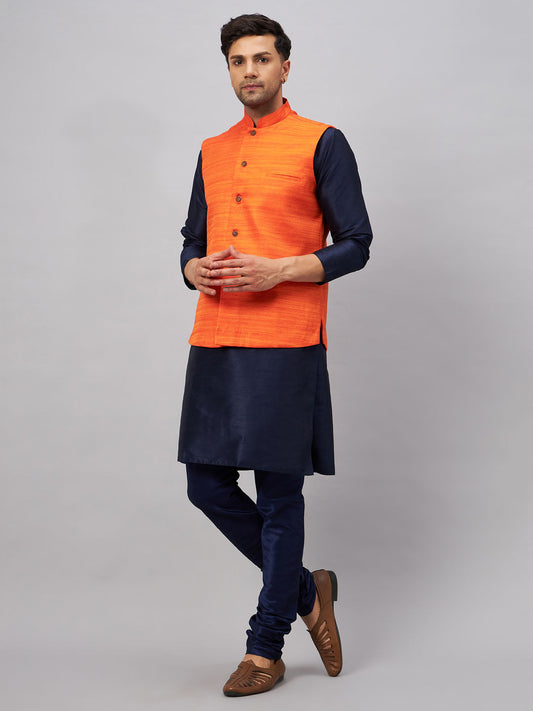 VASTRAMAY Men's Orange Jacket With Navy Blue Kurta And Pyjama Set