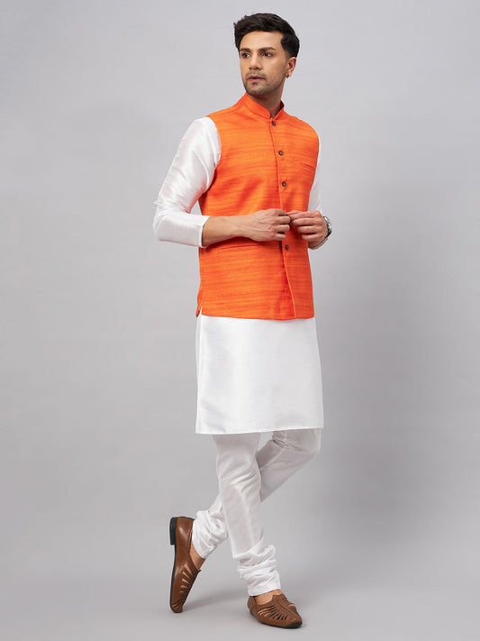 VASTRAMAY Men's Orange Matka Silk Nehru Jacket With White Silk Blend Kurta Pyjama Set